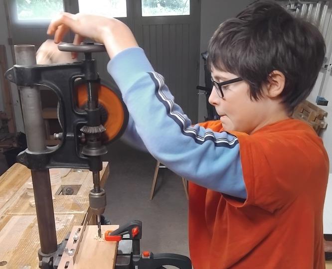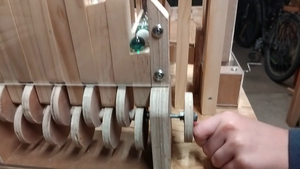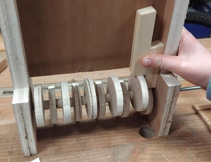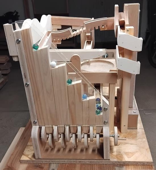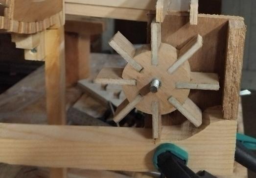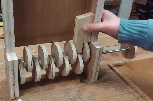 Le premier mécanisme de remontée des billes : l'escalier. Le principe est de transformer le mouvement circulaire de la manivelle en mouvement linéaire, à l'aide de cames. Il a fallu préparer 11 cercles (10 pour les cames et 1 pour la manivelle) dans du contreplaqué de 10 mm. Tout d'abord avec l'aide de mon petit-fils, il a fallu percer les trous décentrés. ![]() ![]() ![]() On place d'abord la première marche sur la came en position haute, et il suffit de tracer la hauteur de la marche suivante, qui est en position basse. ![]() ![]() ![]() |