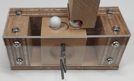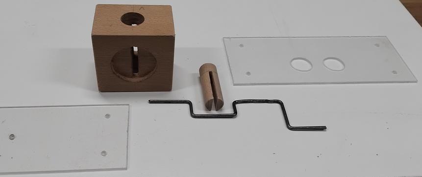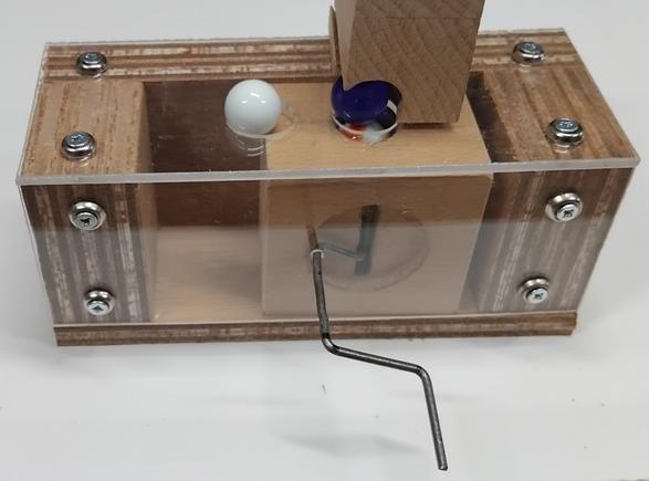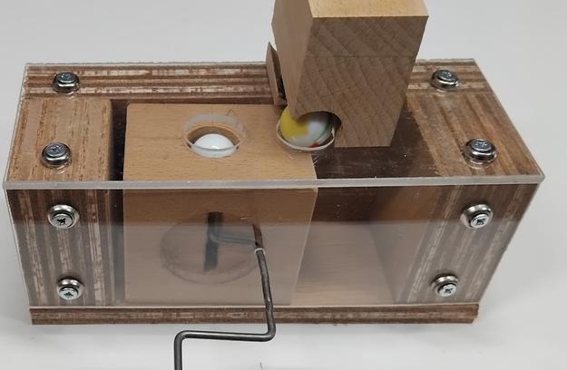 Le deuxième mécanisme de remontée des billes : la pompe. Comme pour les parois de l'escalier, j'ai employé du plexiglass pour laisser visible le mécanisme. Ici, le principe est de faire venir une bille sur un piston en bois, descendre ce piston, et le déplacer pour faire remonter la bille dans une colonne. Le piston est un bout de tige ronde avec une fente correspondant à l'épaisseur de la tige métallique servant de vilebrequin et de manivelle. Ce piston est placé dans un cube qui va coulisser latéralement. En effet, quand on va tourner la manivelle, celle-ci pivotant sur un axe fixe, le mouvement va en même temps déplacer le cube et faire descendre puis monter le piston. ![]() Même si ce matériau a la double qualité de pouvoir être plié assez facilement et de garder une bonne rigidité ensuite, ça m'a donné, comme on dit... "pas mal de fil à retordre" avant d'arriver au résultat voulu :-) (Je suis plus à l'aise avec le bois qu'avec le métal, il faut bien l'avouer...) ![]() ![]() ![]() Il faut d'abord percer un trou de 18 mm en biais dans un bloc de bois, puis le découper. ![]() ![]() ![]() ![]() ![]() ![]() |