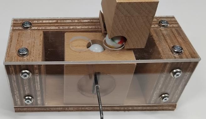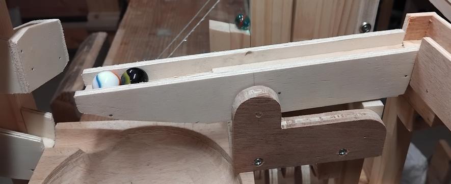 Cette dernière photo est trompeuse : la bascule est en réalité presque horizontale. (Est-ce que je vous ai dit que je suis plus à l'aise avec le bois qu'avec un appareil photo ?) L'astuce pour bien trouver l'endroit où percer l'axe de la bascule, c'est de lui donner sa forme définitive avant de percer. C'est à dire : - creuser la légère encoche qui va retenir les billes - tailler un biseau fort dans la partie sous l'encoche, pour ne pas gêner la libération des billes - tailler un biseau faible du côté opposé, pour que la pièce ne se coince pas avec l'élément qui alimente en billes. Il suffit alors ensuite de mettre trois billes dans l'encoche et de positionner la bascule sur un axe, pour déterminer précisément le point d'équilibre. Il n'y a plus ensuite qu'à percer avec un très léger décalage. J'avais bien pensé à effectuer un calibrage de toutes les billes à 16 mm, car elles n'ont pas vraiment un diamètre constant. Mais j'ai pu constater à l'usage qu'elles n'ont pas toutes le même poids ! Parfois, deux billes suffisent à vider la bascule alors qu'elle était calibrée pour trois. ![]() |