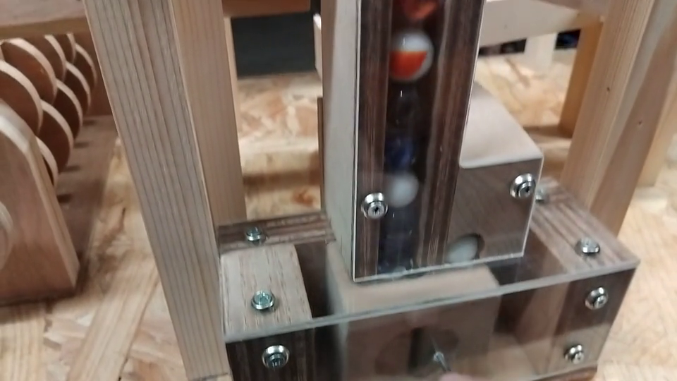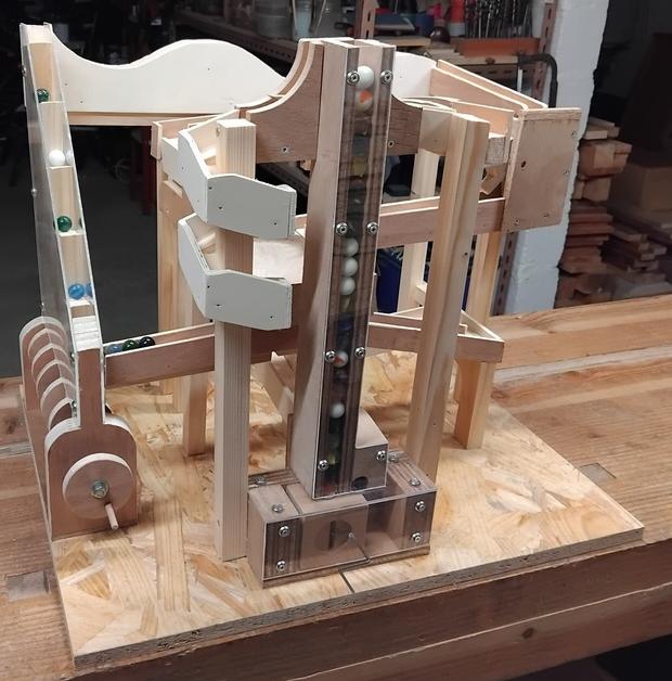 Si vous voulez à votre tour jouer aux billes, vous trouverez ci-dessous des détails sur la fabrication. J'ai construit tous les éléments séparément, et juste à la fin j'ai essayé différentes combinaisons pour les assembler au mieux. La pompe est plus compliquée à mettre au point que l'escalier, mais pour exactement la même hauteur, la différence de niveau entre les points d'entrée et de sortie des billes est plus importante et permet d'utiliser plus d'éléments. |