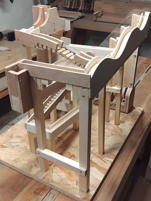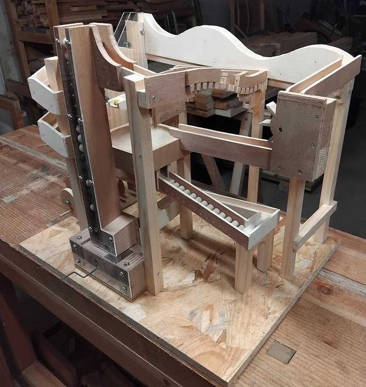 Lorsque j'ai cherché des idées pour fabriquer un circuit, j'ai trouvé deux systèmes manuels intéressants pour faire remonter les billes. Ici une pompe. Et là un escalier. Au lieu de choisir, j'ai décidé de fabriquer les deux :-) Le challenge étant de pouvoir récupérer toutes les billes au même endroit final, et de les redistribuer équitablement entre les deux systèmes de remontée. Ce qui est réalisé au moyen d'un entonnoir sous lequel est placé un aiguillage à bascule. Depuis l'escalier, un seul parcours est possible, passant par les montagnes russes et une petite roue à aubes. En revanche, au sommet de la pompe un aiguillage automatique permet alternativement aux billes de descendre par un toboggan tournant autour d'un tasseau, ou de rejoindre une bascule en passant sur un pont suspendu. Ne me demandez pas de plan, car je n'en avais pas. Juste des photos, mais ça suffisait pour comprendre et reproduire les mécanismes. Dimensions de l'ensemble : 53 cm x 43 cm et 44 cm de haut. |