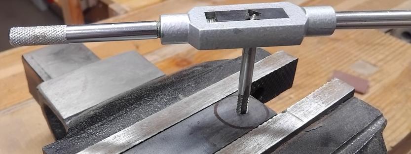 Ne trouvant pas aisément de molette adaptée pour le réglage de profondeur de la guimbarde, je commence par sa fabrication. Je sors ma bonne vieille perceuse à colonne. ![]() Puis je taraude à 6 mm. ![]() ![]() |