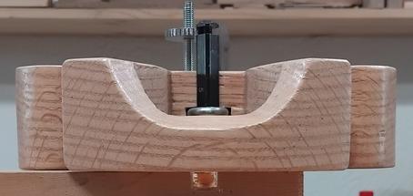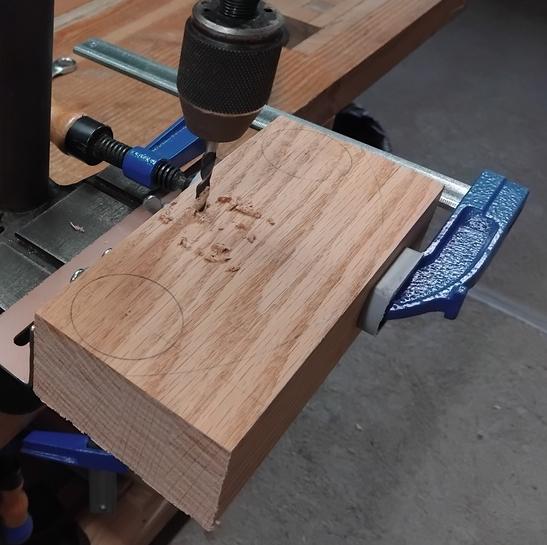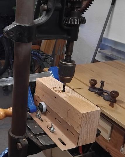 Je reviens à la perceuse à colonne pour percer deux axes de 6 mm, dans un bloc de chêne de 200x95x50 mm.![]() ![]() |