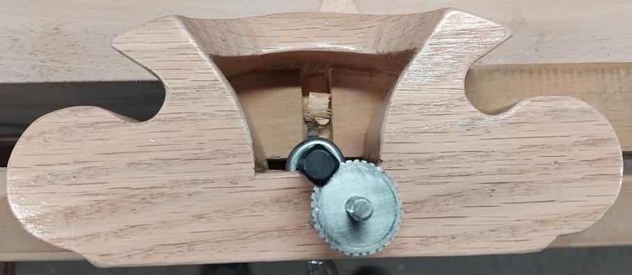 Et au moment de l'assemblage final, c'est le drame... Parce que, comme sur la Stanley métallique, j'ai placé l'écrou de serrage et la tige de réglage de profondeur dans le même alignement, derrière le fer ! ![]() Fort heureusement, l'erreur est rattrapable. Il suffit de boucher le trou vertical et de repercer en le décalant... OUF ! ![]() ![]() Pour que la tige filetée ne pivote pas, sur le dessus de la guimbarde j'ai encastré un écrou, et il y a un contre-écrou de blocage au dessous. ![]() |