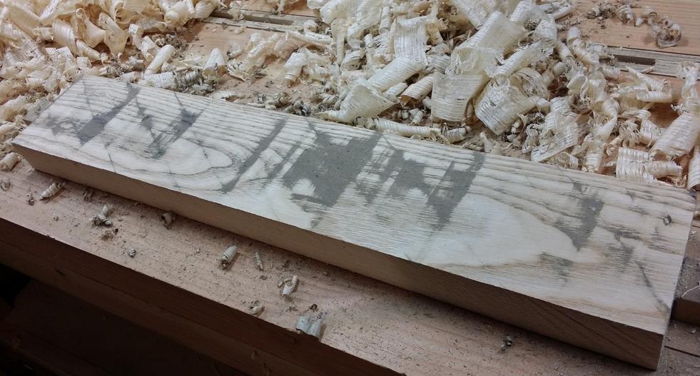 Sur cette photo, on voit nettement les passes du riflard en diagonale, sur un beau morceau de frêne.