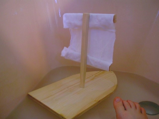 Dans une baignoire, le bateau flotte, mais en pleine nature, le vent a eu vite fait de faire le chavirer. Cela a suffi à tremper la voile qui du coup était nettement plus lourde et l'empêchait de se redresser...