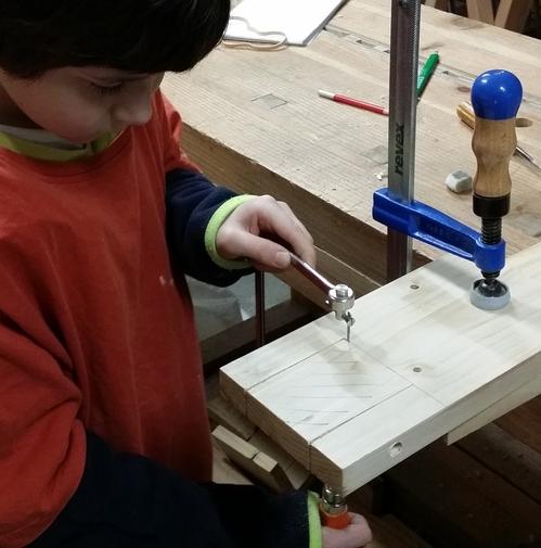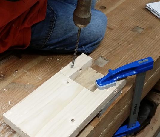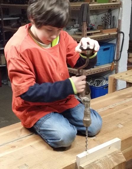 Sur les côtés du bateau, il perce des trous de 10 mm au vilebrequin. C'est l'outil qu'il a le plus aimé employer aujourd'hui.![]() |