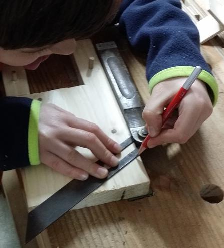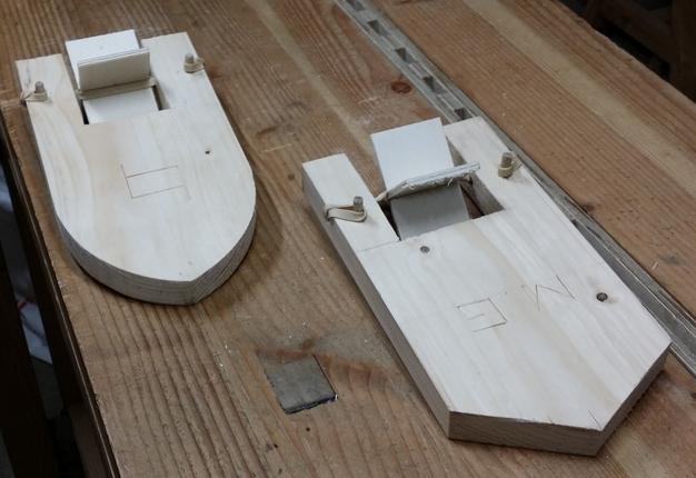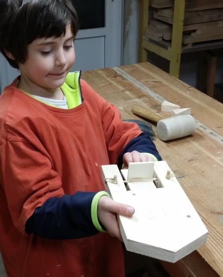 Cette fois-ci, je ne fais rien. Le petit-fils a accepté le défi de réaliser, pile le jour de ses sept ans et demi, un objet en bois. Bien sûr je le guide dans les opérations, je l'aide à avoir le bon geste, mais c'est lui qui trace, scie et perce tout seul. Ce sera donc un petit bateau à aubes, constitué d'une plaque de sapin de 26 x 13 cm en 23 mm d'épaisseur, deux ailettes de 8 x 5 cm en contreplaqué de 5 mm, et un gros élastique. |