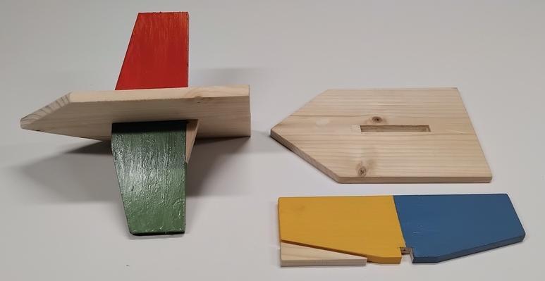 Outillage nécessaire : - scie à dos - maillet - ciseau de 10 mm Bois : - 3 bouts de volige 220 mm x 140 mm x 10 mm Une des trois planches est recoupée dans la longueur, de façon à obtenir deux pièces de 220 mm x 70 mm, servant de "voile-quille". Une planche de volige taillée en pointe formera la "coque", et dedans, on creuse une mortaise de 70 mm de long. La voile-quille est symétrique. Une encoche de 10 mm x 10 mm au centre servira à coincer l'élément au bon endroit dans la coque. On notera que le coin découpé dans la voile-quille est récupéré pour bloquer cette pièce. La mortaise est donc taillée en biseau du côté de ce coin. ![]() |