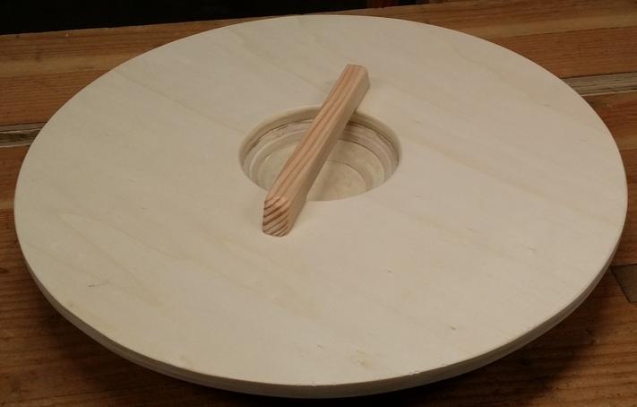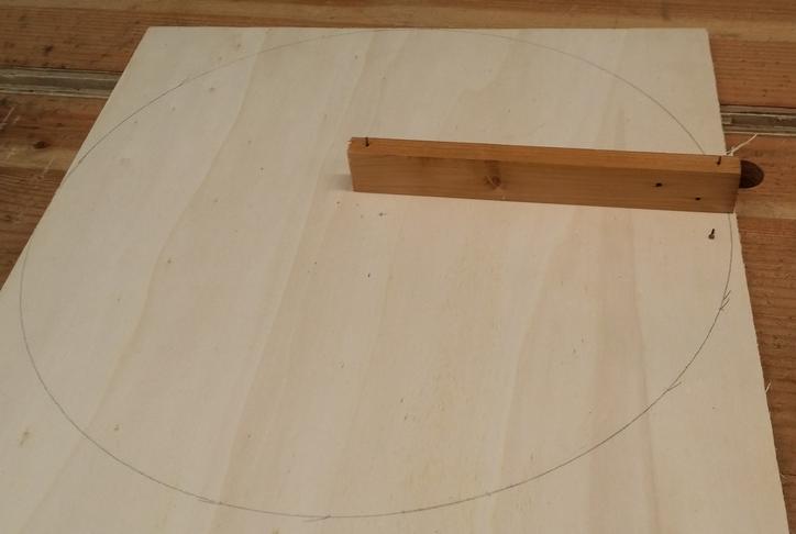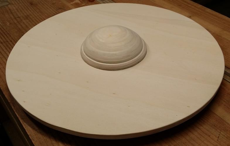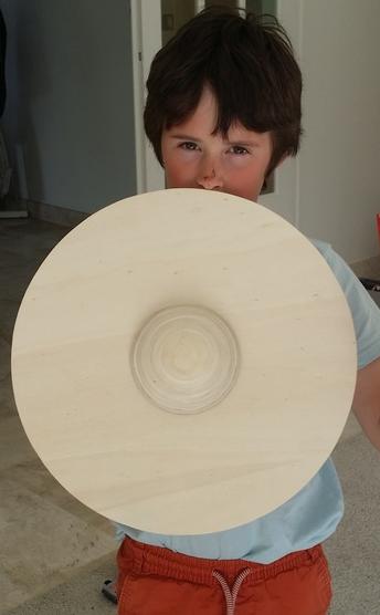 Mon petit-fils m'a demandé de lui fabriquer un bouclier. La seule exigence est qu'il soit rond. Plutôt que simplement découper un cercle dans du contreplaqué, je lui ai proposé alors de réaliser un modèle de type viking, avec la bosse au centre nommée "umbo". Seule différence : cet "umbo" sera en bois, et pas en métal. |
