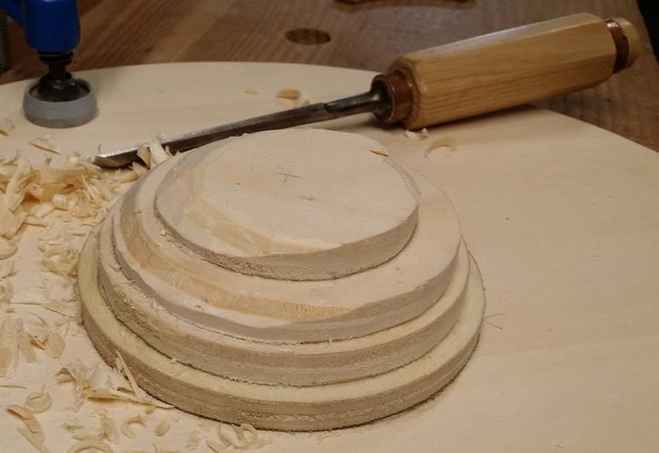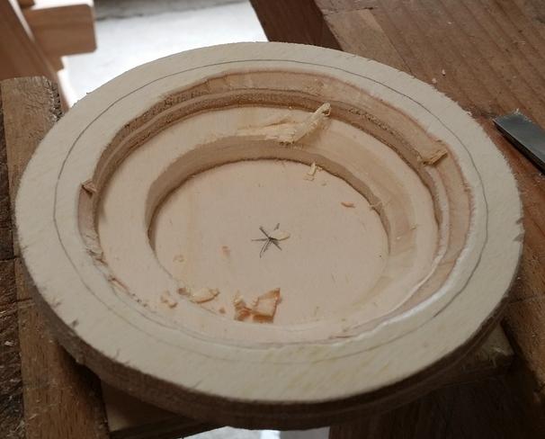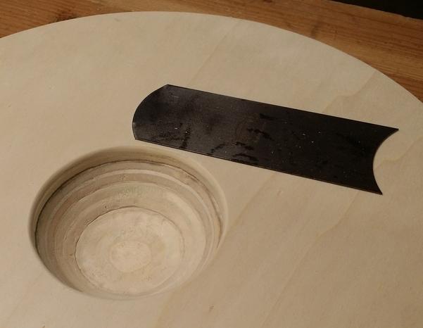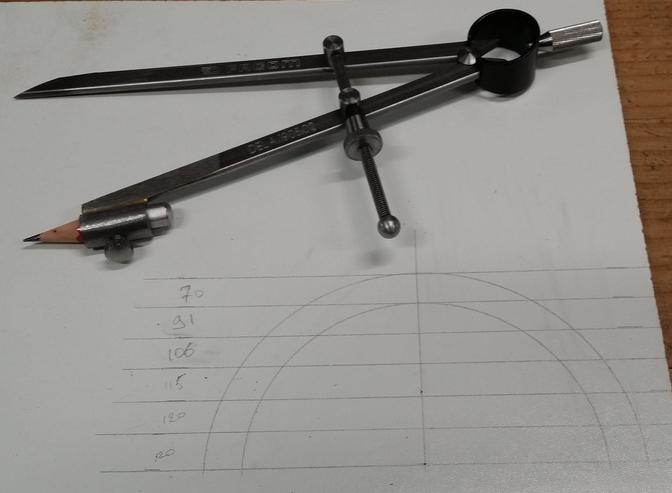 Traçage de la forme du "umbo", pour déterminer la taille des différents anneaux en contreplaqué à superposer. Mon petit client trouvant que ça fera trop bombé, finalement je ne garderai que les 4 du haut. ![]() |