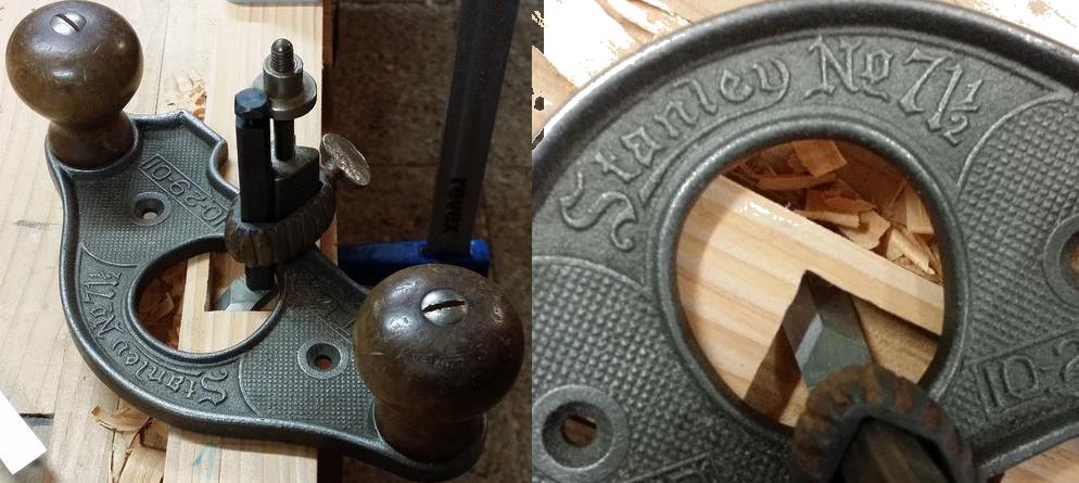 Pour la presse, on prend un bloc de frêne et une tige de 14 en hêtre, filetée en grande partie. ![]() ![]() Un test de taraudage dans le douglas n'a pas été concluant, c'est trop tendre. ![]() Je fais ça au ciseau, mais surtout avec une de mes dernières acquisitions : une guimbarde Stanley 71 1/2. Ce modèle a été fabriqué entre 1911 et 1924, mais il a tellement servi que le fer d'origine était inutilisable... Heureusement, Veritas a eu la bonne idée de rendre les fers qu'il vend avec ses propres guimbardes, compatibles avec les Stanley. ![]() On distingue, en haut du pied, le tenon qui sera pris dans une mortaise du plateau. ![]() |