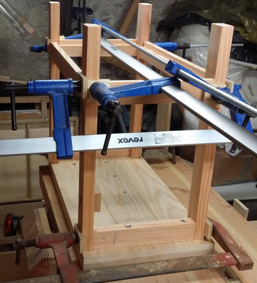 Enfin l'assemblage ! Le piètement est collé, et renforcé par des tourillons. Les pieds en façade se prennent dans des mortaises. Il y a du jeu latéral pour les vis, pour permettre au plateau de bouger. ![]() |