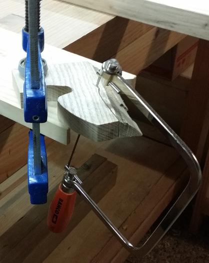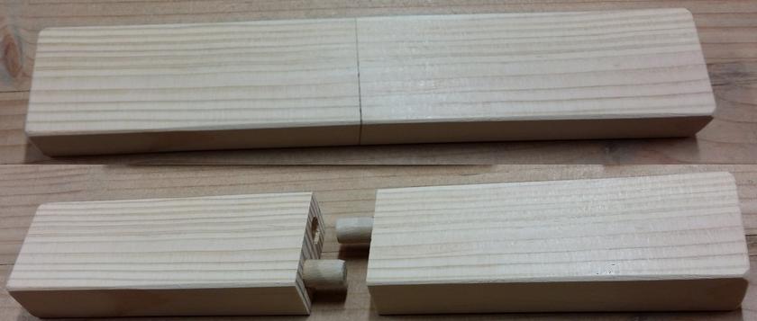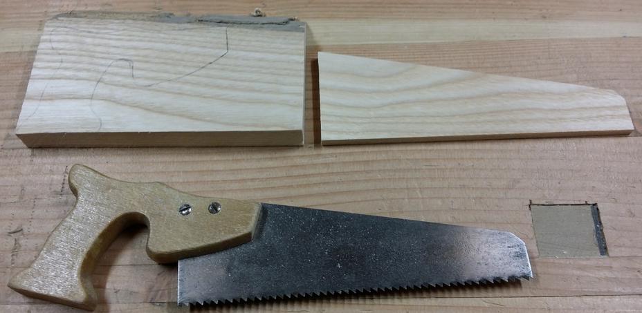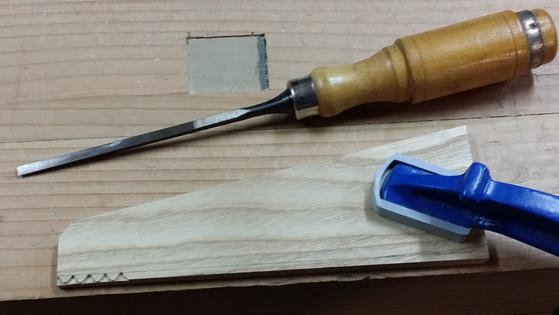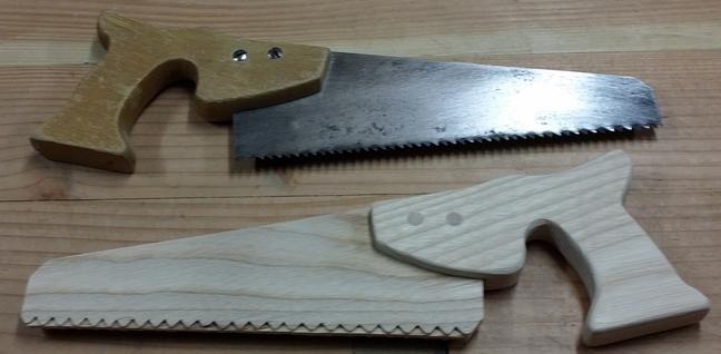 Fabrication de la petite égoïne. J'ai déjà une petite égoïne taille enfant. Elle coupe très bien mais ce n'est pas un objet à laisser utiliser sans surveillance. Je m'en sers donc comme modèle. ![]() ![]() La lame en frêne fait 6mm d'épaisseur, je taille au ciseau la forme des dents de chaque côté, mais en laissant une bande de 2 mm au milieu. ![]() ![]() Du coup, j'ai repensé aux Lego :-) Et j'ai fait un bout de bois qu'il pourra faire semblant de scier et désassembler. ![]() |