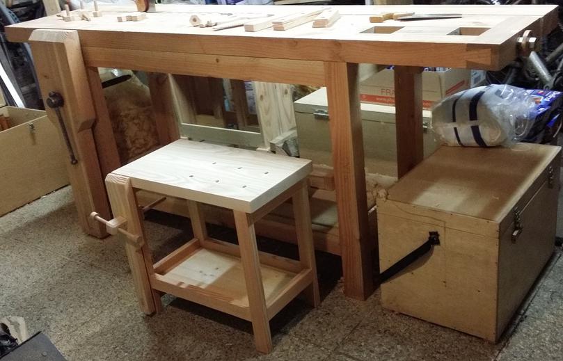 L'établi terminé, devant le mien. Les deux ont été réalisés entièrement à la main. Mais c'était quand même nettement plus facile de fabriquer le petit à l'aide du grand, que pour le grand alors que je n'avais rien ! ![]() |