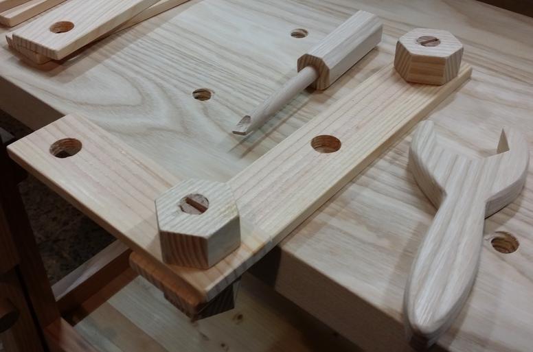 Le petit-fils a deux ans et demi, et chaque fois qu'on passe à la cave prendre sa draisienne, il en profite pour demander à farfouiller dans ma caisse à outils.... J'ai donc décidé de lui fabriquer un établi à sa taille, plus quelques outils. Dimensions : 500 mm de haut, plateau de 500 mm sur 300 mm. Bois employés : pin Douglas pour le piètement, frêne pour le plateau et hêtre pour les tiges rondes. Et comme d'habitude, réalisation uniquement à la main : l'électricité c'est juste pour la lumière ! |