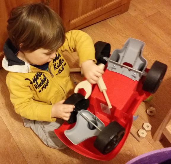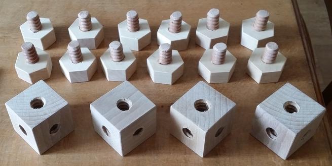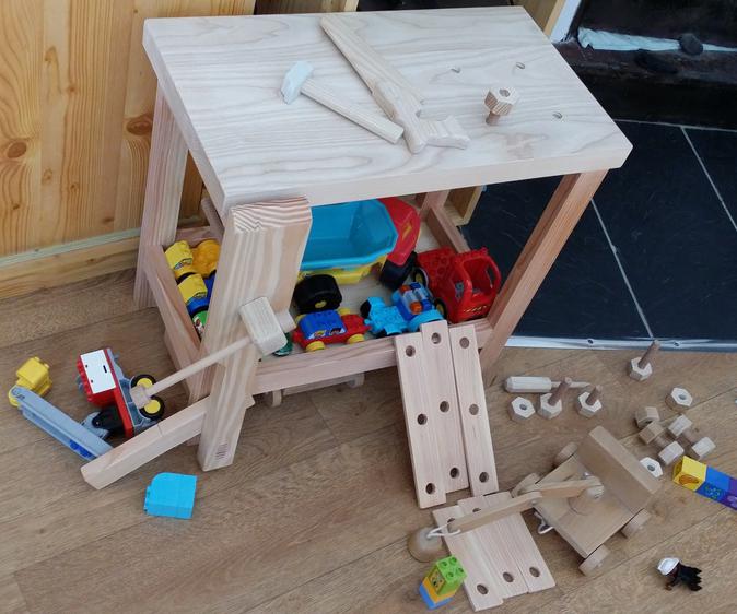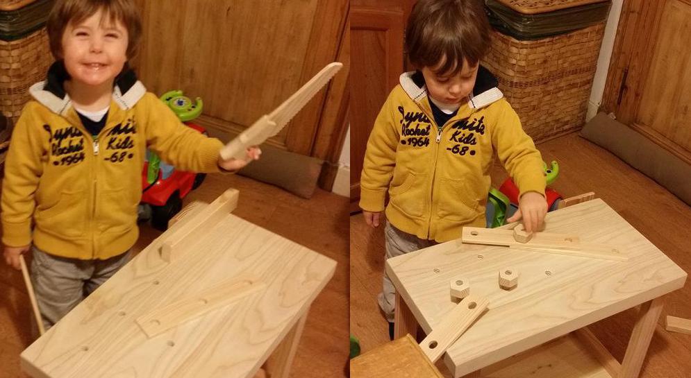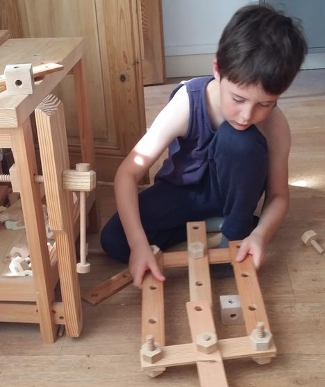 Mise à jour : L'établi a été construit il y a trois ans et demi, le petit bonhomme a maintenant six ans. S'il utilise moins avec l'établi lui-même et les faux outils, il joue encore souvent avec les accessoires (plaques percées, vis et écrous). C'est ce qui m'a décidé à en fabriquer d'autres, et ajouter des cubes pour augmenter les possibilités. ![]() ![]() ![]() |