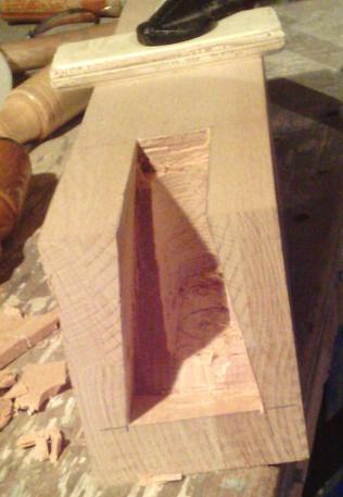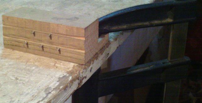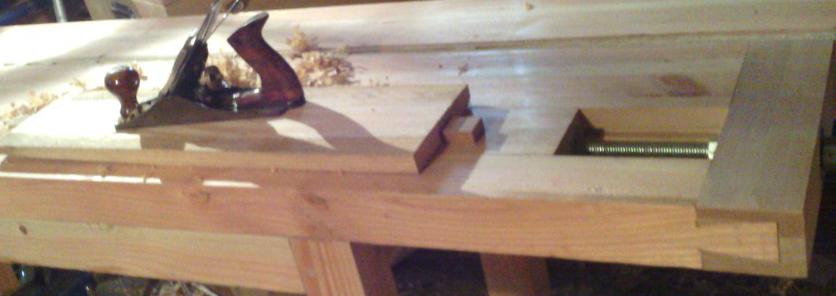 | L'établi est réalisé principalement en douglas, mais j'ai récupéré quelques chutes de hêtre. J'en ai mis un morceau dans le haut de ma presse, et je fais une entaille dans le plateau, en face de la presse, pour renforcer aussi cet endroit. |