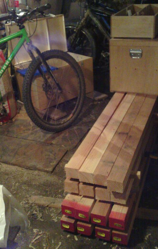 | Le tas de chevrons en douglas qui va devenir l'établi. |