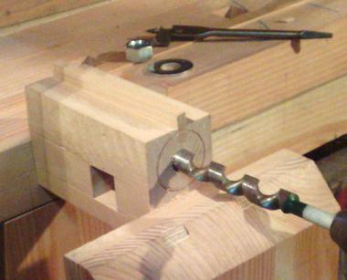| Plutôt que de percer à travers tout une fois l'assemblage effectué, je préfère percer séparément le tenon et la mortaise, avec un léger décalage, pour réaliser un chevillage à tirer. Je n'oublie pas de percer aussi les trous qui recevront les tirefonds, qui fixeront le plateau au piètement. |