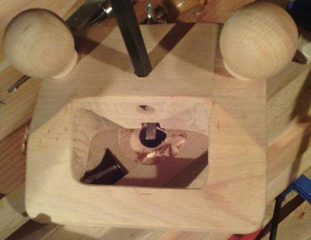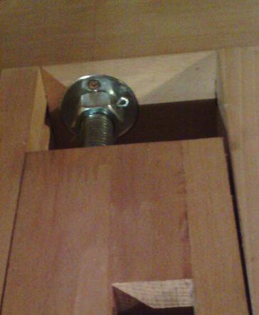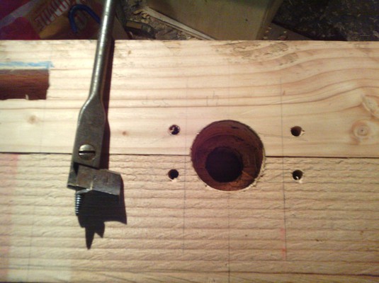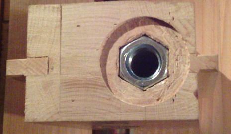 | Percer un trou de 18 mm dans du hêtre bien dur, sur 15 cm et surtout en bois de bout, ça n'est pas facile ! Et aussi, j'avais peur de me louper et dévier...Pour minimiser le risque, j'ai percé à moitié de chaque côté, mais j'ai bien visé et la tige filetée est passée sans avoir besoin d'ajuster ! |