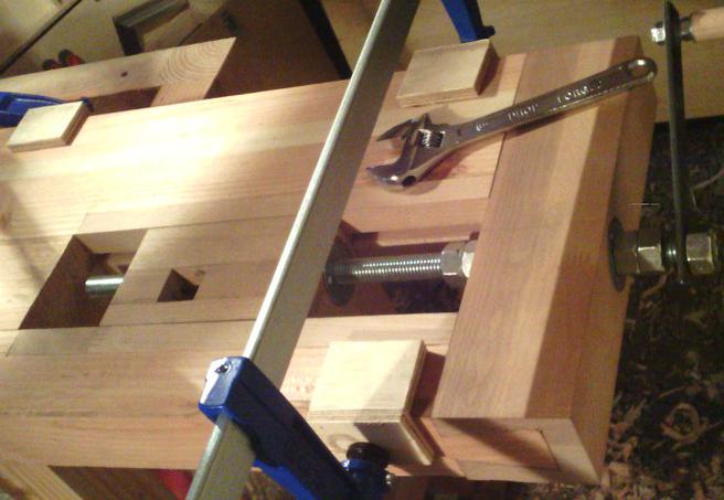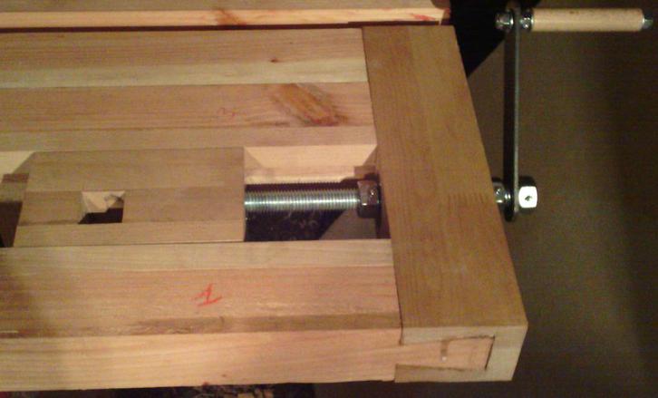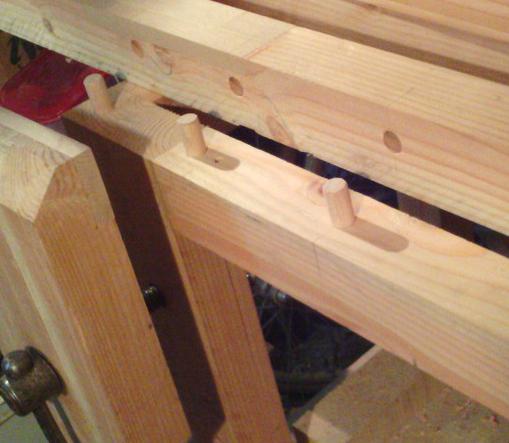 Le projet de départ, c'était un établi minimaliste, et je pensais simplement fixer le plateau avec des tire-fonds. Mais entre temps je me suis trouvé une vis d'établi en occasion (10 euros) et j'ai fabriqué une presse. Du coup, puisque je n'avais pas prévu de tenons pour solidariser piètement et plateau, j'ai fabriqué quelques tourillons dans une tige ronde de 18 mm, en hêtre. |