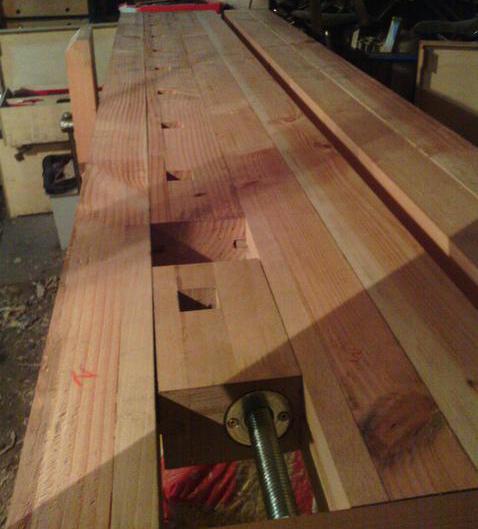Une fois les 3 pièces collées, avec une fausse languette en contreplaqué de 10, je passe à l'étape suivante. J'ai récupéré du hêtre, deux blocs de 450x450x40 lorsque le fiston m'a demandé de faire des découpes dans le plan de travail de sa cuisine. Je vais renforcer l'établi, réalisé en douglas, avec ce bois dur aux endroits stratégiques |