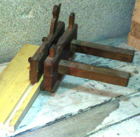 Comme je fabrique un établi, c'est que je n'en ai pas ! Et donc pour raboter, il faut faire avec les moyens du bord... Je me suis fabriqué deux griffes rudimentaires, que je fais tenir avec des serre-joints sur la vieille table trouvée dans la cave. |
