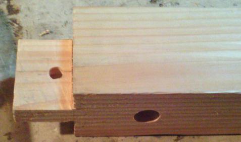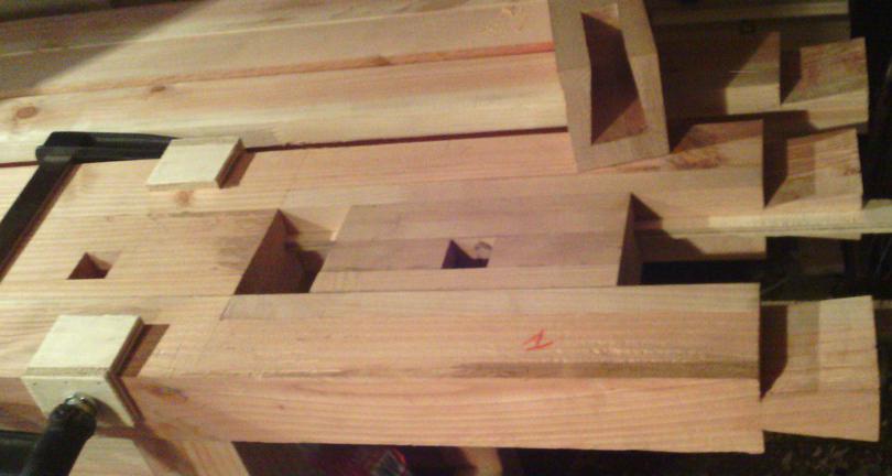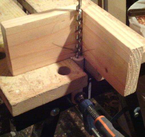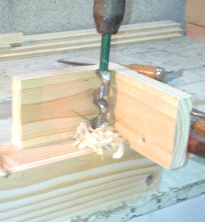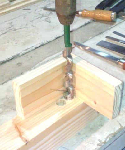 Pour fabriquer les mortaises, je me suis fabriqué un petit guide : deux simples planches assemblées d'équerre. C'est tout simple, mais très pratique pour percer droit au vilebrequin |