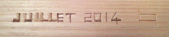 J'oubliais : avant de fixer le plateau sur l'établi, j'ai gravé la date dessous. Mon petit-fils étant arrivé le 8 juillet, je pourrai lui expliquer plus tard que cet établi a exactement le même âge que lui ! |