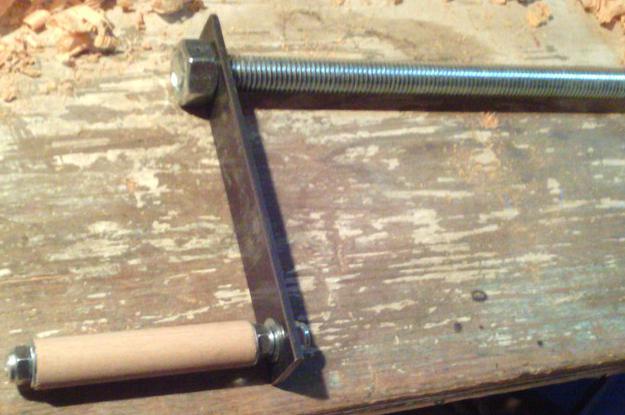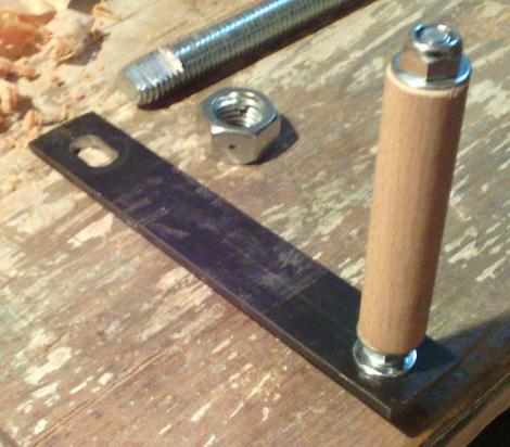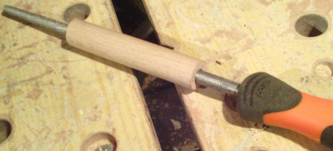 Pour la presse de bout, je n'ai rien trouvé en occasion. L'élément principal est une tige filetée de 18 mm. Pour la manivelle, c'est un fer plat de 40 mm, et un bout de tige filetée de 8 mm. Je perce un trou de 8 mm dans une tige ronde en hêtre de 18, jusqu'à à mi-distance de chaque côté : |
