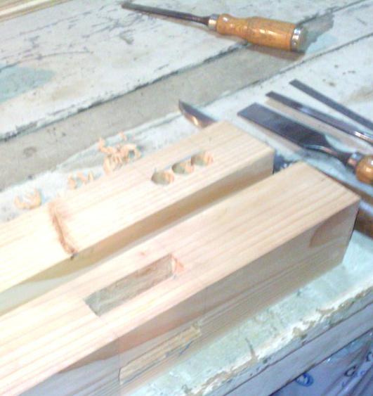 | Fabrication des trous carrés. Quelques coups de scie à dos, finition au ciseau : ça va assez vite. |