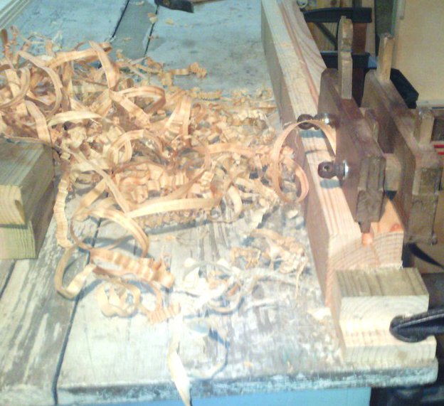 La pièce de bois est bien maintenue par les deux griffes, mais la table bouge... C'est utilisable quand même, heureusement. J'adore les longs copeaux que ça fait. Ça change de la toupie ! Et je suis surpris, ça va assez vite. |