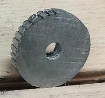 Découpe à la scie à métaux.![]() Puis finition à la lime pour obtenir un cercle. Je dois limer également en épaisseur car l'encoche dans le fer Veritas fait légèrement moins que 4 mm. ![]() Et enfin, des entailles à la scie pour obtenir le crantage de la molette. ![]() |
