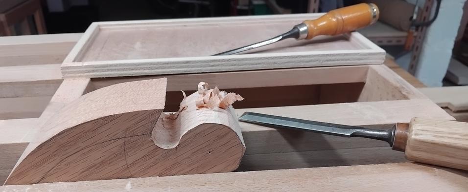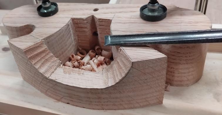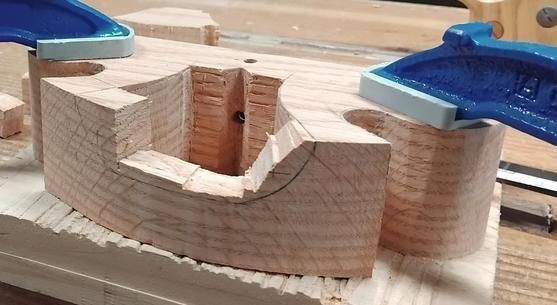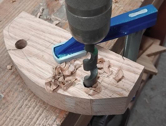 Pour découper la forme de la guimbarde, j'ai commencé à la scie à chantourner, mais sur 50 mm d'épaisseur et en chêne c'est trop fastidieux... Je suis bien plus efficace en dégrossissant à la scie à dos et en finissant au ciseau. Mais d'abord, je sors le vilebrequin :![]() ![]() ![]() |