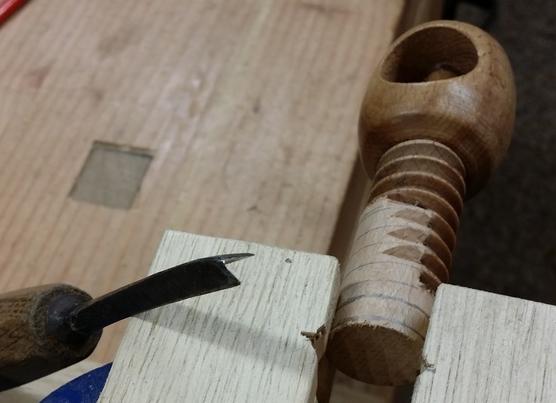Après traçage de la prolongation du filetage, sculpture à la gouge en V.![]() |