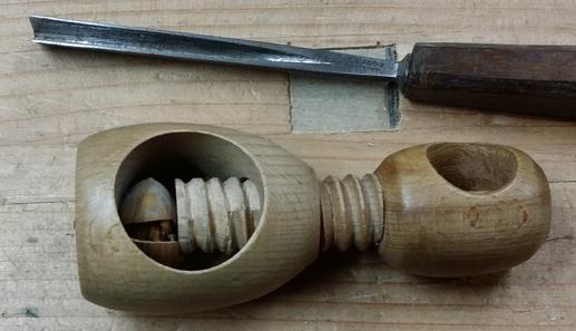 C'est la saison des noix et noisettes. Il existe des pinces, mais souvent en cassant, la coque explose... C'est pour cela que je préfère le modèle avec une vis en bois. Les débris de la coque ne se répandent pas partout ! Mais après plusieurs années de service intensif, mon casse-noix a rendu l'âme, le bout de la vis étant complètement usé... Ne possédant pas de filière à ce diamètre, je décide de tenter la réparation. |