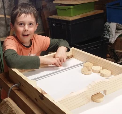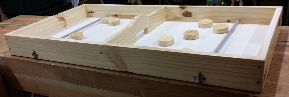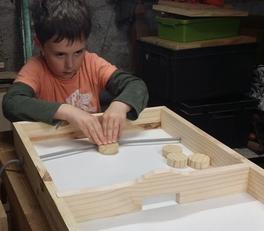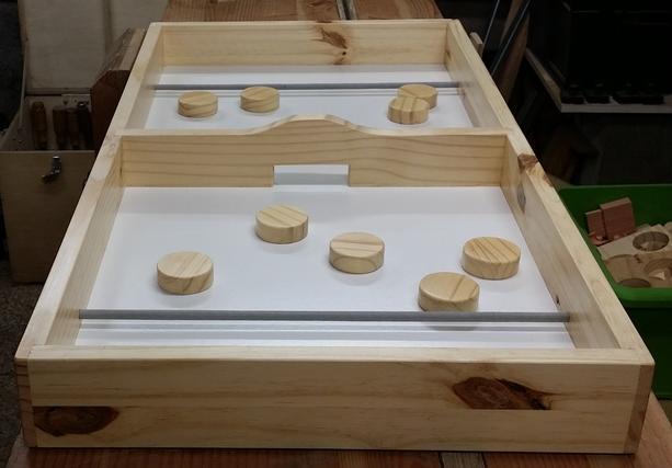 Chaque joueur dispose de 5 palets dans son camp, et doit les envoyer dans le camp adverse au moyen de l'élastique. Le premier qui n'en a plus dans son camp a gagné ! ![]() |