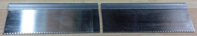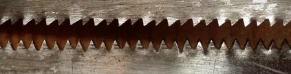 La denture d'origine (en bas sur la photo) ne me convient pas complètemement. Le nombre de dents au cm est correct, mais elles sont droites, alors je les lime pour avoir une dentition en rip cut. ![]() |