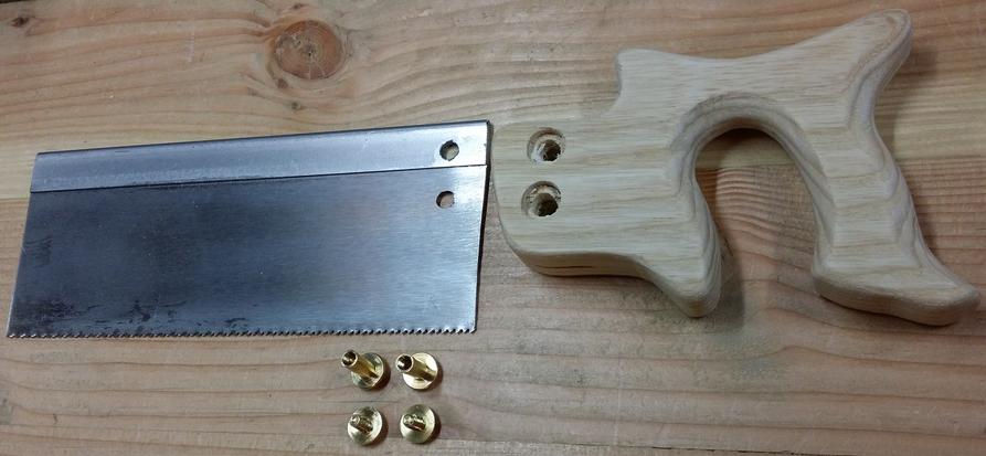 Ne me demandez pas où j'ai trouvé ce jeu de vis... Je me souviens juste l'avoir récupéré sur une quincaillerie en me disant que ça servirait un jour ! La poignée est en frêne. J'étais parti sur une forme fermée, classique. Mais en y réfléchissant, la main du petit bonhomme va vite grandir, alors j'ai opté pour une poignée ouverte. ![]() |