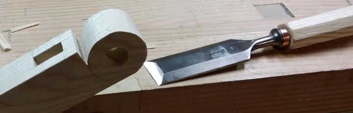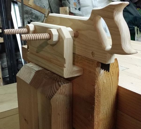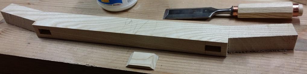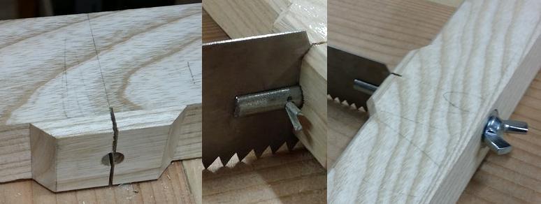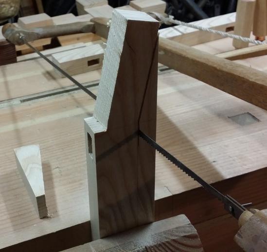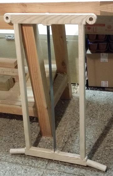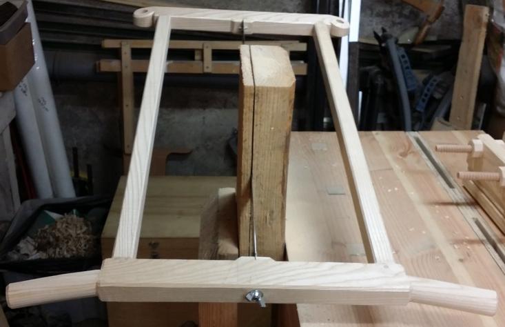 Je passe sur le débit des quatre bouts de frêne, et les assemblages classiques pour passer aux parties spécifiques de cette scie .