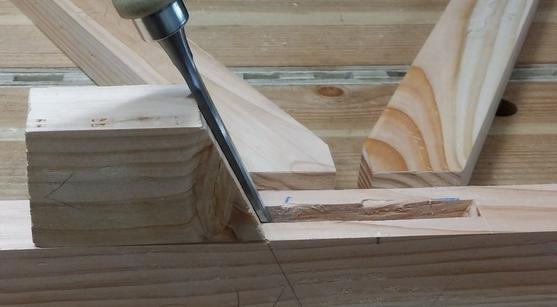 Leur fabrication, entièrement manuelle comme d'habitude, n'a rien de compliqué. Il faut juste être très minutieux pour le report des mesures et des angles, à partir d'une épure à l'échelle 1:1 Et surtout, ne pas jeter tout de suite les chutes : ici, je m'en sers de guide au ciseau pour l'angle de la mortaise. ![]() |