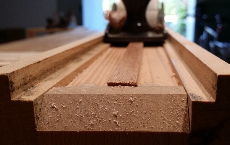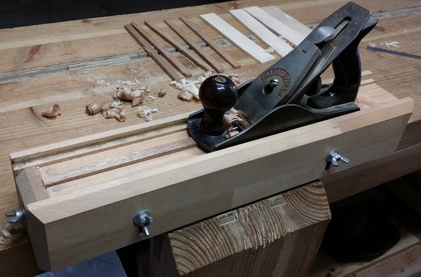 On m'a demandé des détails sur un guide de rabotage, que l'on peut voir dans plusieurs de mes réalisations. Son but est de raboter des pièces de bois de très fine épaisseur, de manière constante. Je n'ai rien inventé : on en trouve diverses variantes sur internet en recherchant avec les mots clef "gabarit kumiko". Mais comme je ne fabriquerai jamais de kumiko, je préfère l'appeler "guide de rabotage" :-). ![]() Le principe est simple : le rabot coulisse sur les joues dont la hauteur est réglable, et dès qu'il ne prend plus de copeau, c'est que l'épaisseur voulue est atteinte. ![]() |