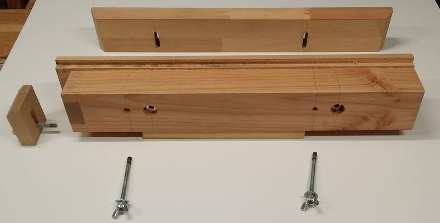 Je n'ai pas pris de photos au cours de sa fabrication, mais le démontage permettra d'en comprendre le principe. Il y a donc un socle, deux joues, et une butée. Le socle est un simple bloc en douglas. Un tasseau fixé dessous permet de maintenir le guide dans la presse de l'établi. Les deux joues sont en bois dur (chutes de tablette hêtre dans mon cas) sur lesquelles coulissera le rabot. Chaque joue est réglable en hauteur grâce à deux vis papillon (je n'en ai pas trouvé de taille me convenant, alors j'en ai fabriqué avec de la tige filetée de 6 mm, et un écrou papillon bloqué avec un contre-écrou). On notera que les trous de chaque joue sont légèrement décalés. ![]() ![]() |