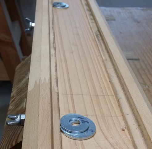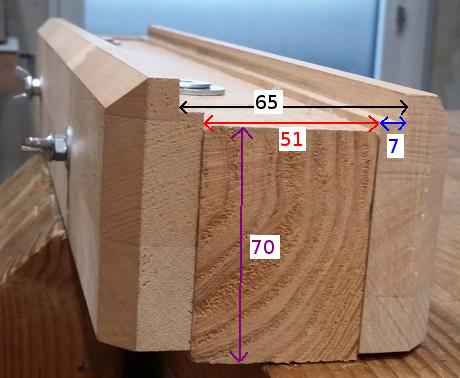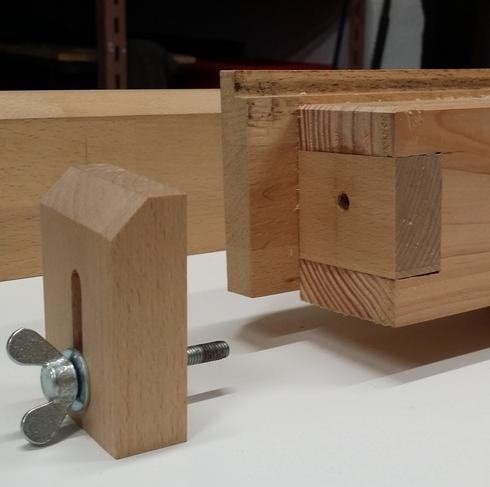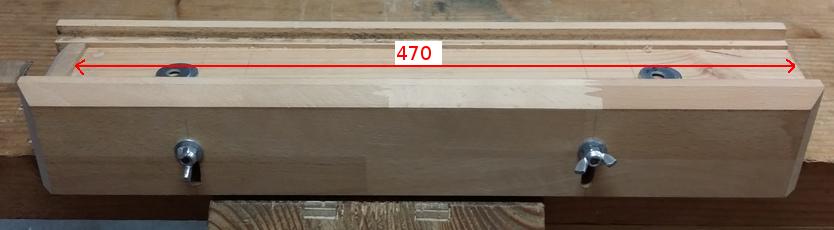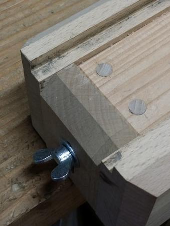 La butée est également en hêtre. En raison des efforts exercés sur cette butée, la pièce de bois qui comporte l'écrou à insérer est solidarisée avec le socle en douglas avec deux tourillons, qui traversent le socle de part en part. Il faut bien évidemment régler cette butée juste un peu au dessous des joues. ![]() |