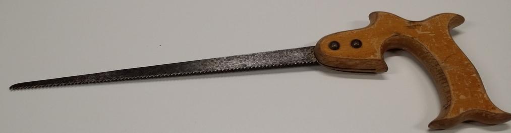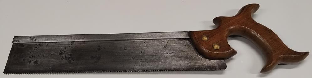 Scie à dos, à poignée pistoletUne petite scie à dos avec une poignée peu commune, de marque inconnue, en 9 TPI.Trouvée pour 2 euros en brocante, il a juste fallu la redresser et l'affûter. ![]() |